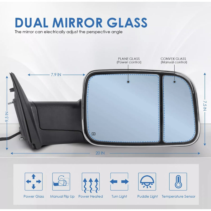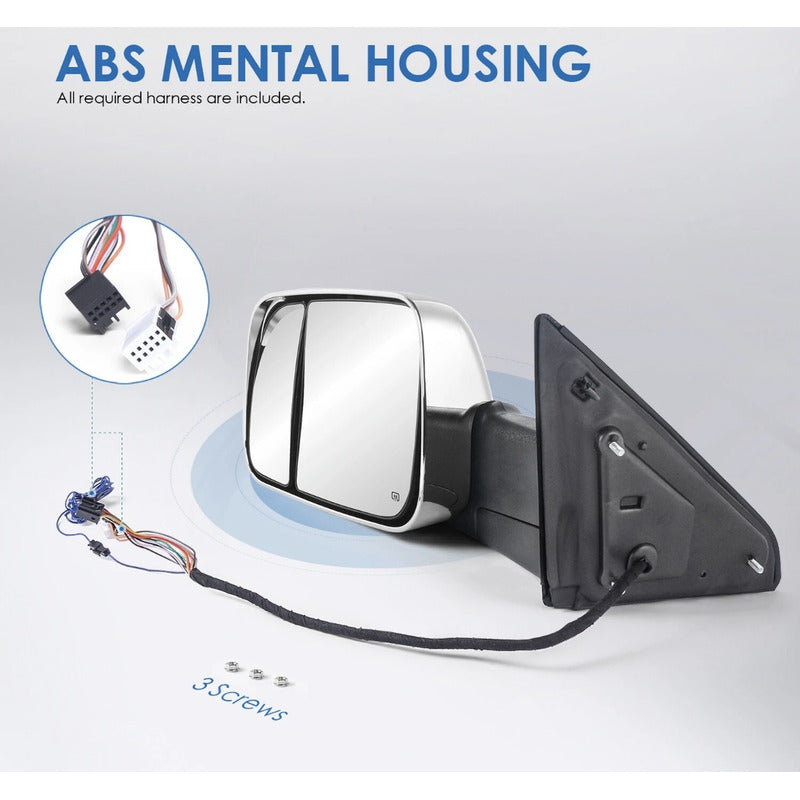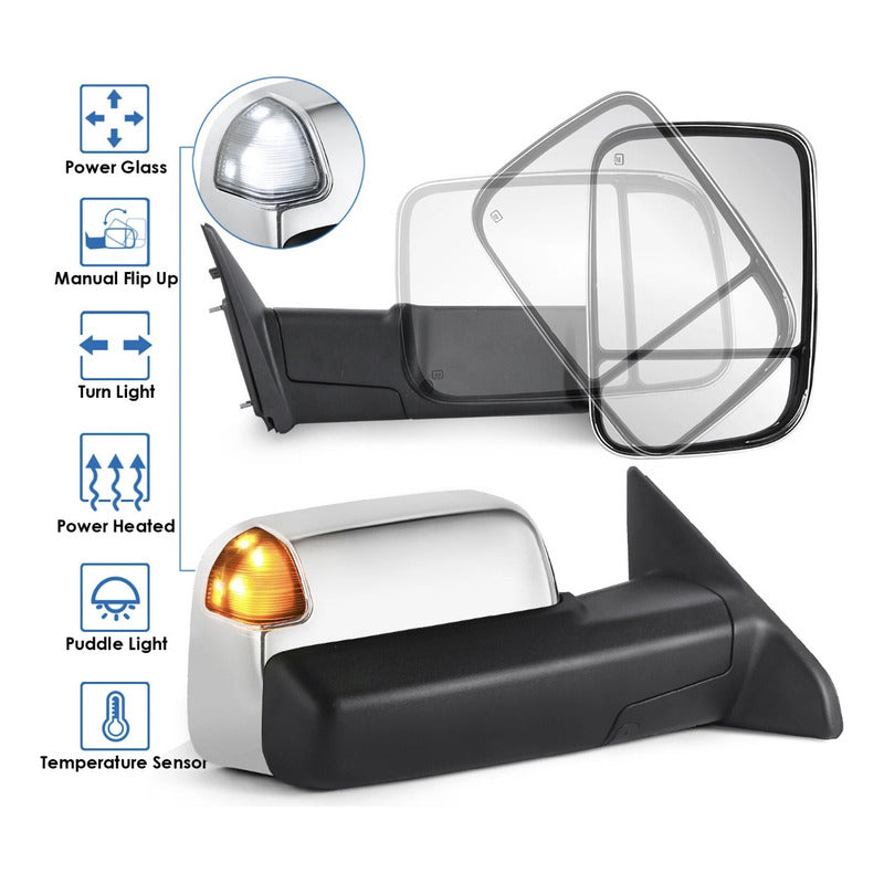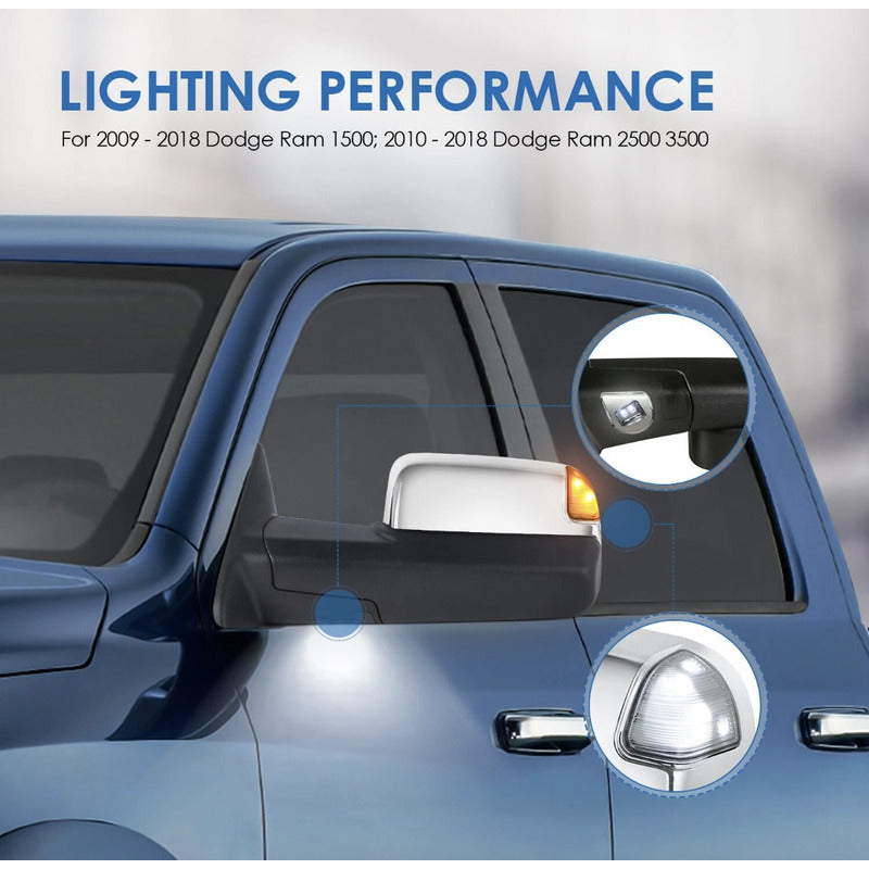 Características · Completamente nuevo · Incluye un par, para el conductor y el pasajero. · Eléctrico, ajustable, calefactado, con luces direccionales, luz de charco, sensor de temperatura y luz de posición blanca. · Fácil instalación: Plug & Play. Compatibilidad Para Ram 1500 2009-2018 Para Ram 2500 2010-2018 Para Ram 3500 2010-2018 Nota: El cable de las direccionales está incluido. El comprador debe realizar el cableado de las luces de posición. ¿TIENES ALGÚN PROBLEMA CON LA COMPRA? No inicies un reclamo, antes danos la oportunidad de solucionarlo. *SE RECOMIENDA CONFIRMAR EXISTENCIA ANTES DE COMPRAR EL ARTÍCULO, YA QUE SON ARTÍCULOS BAJO PEDIDO Y EL STOCK CAMBIA CONSTANTEMENTE *LOS PAQUETES TARDAN DENTRO DE 7-12 DÍAS EN ENVIARSE A SU DESTINO #Betuning #Expertosenloquehacemos IMPORTADORA DE AUTOPARTES TMX SA DE CV.